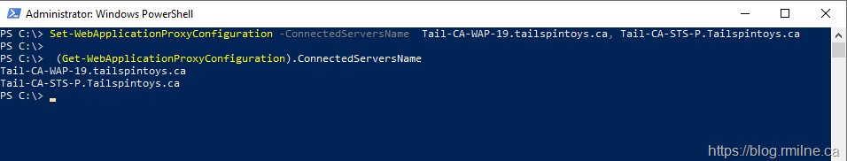 Set-WebApplicationProxyConfiguration –ConnectedServersName Tail-CA-WAP-19.tailspintoys.ca, Tail-CA-STS-P.Tailspintoys.ca