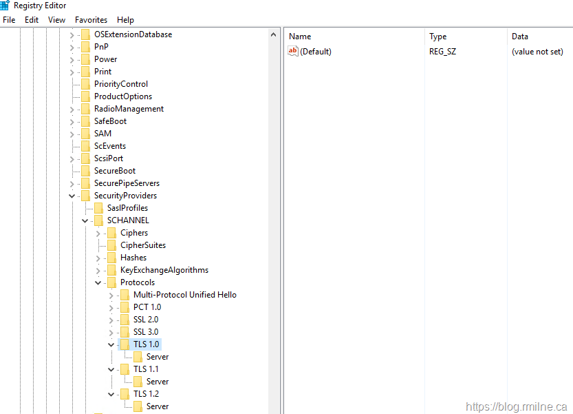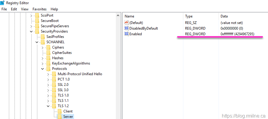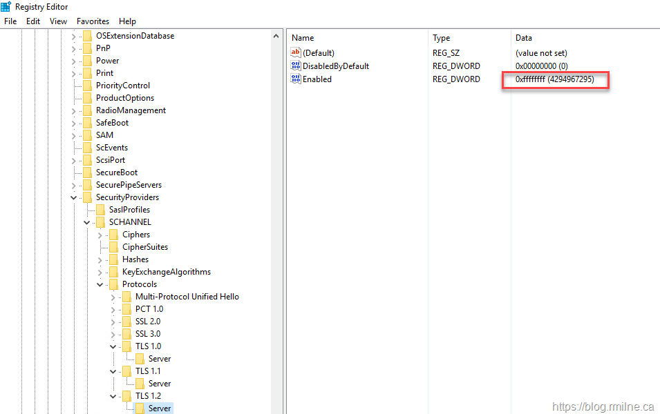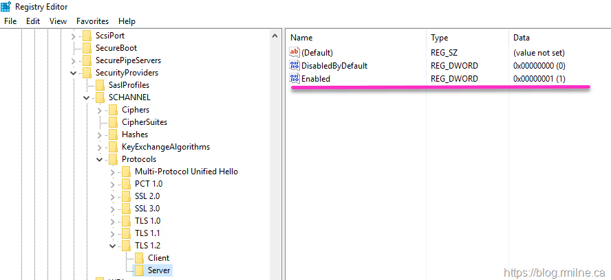 This is something to remember, and we will circle back to what is documented and supported further on in the post.  The protocol enablement/disablement that is achieved in the registry using the keys as noted here: Transport Layer Security (TLS) registry settings | Microsoft Docs