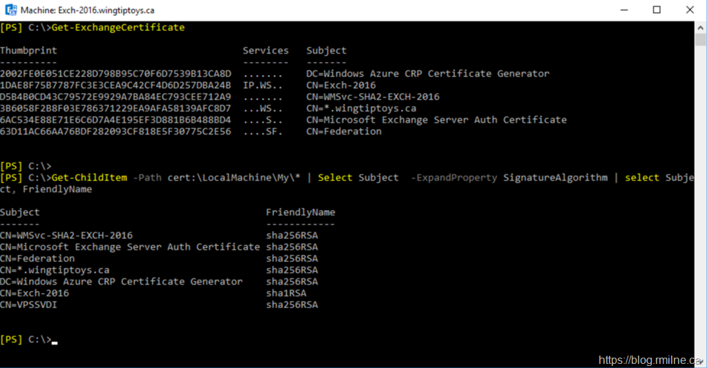 As a brief reminder there were changes made in the Exchange 2016 CU2 timeframe on how Exchange generates self signed certificates.  In the olden days, Exchange would only ever generate SHA1 based certificates.  That applied to the certificate generated at installation time and on subsequent activities after the server was installed.