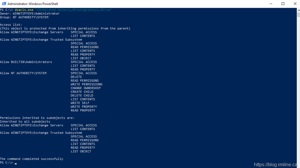 Running the sample code above also reports the permissions before and after on the Deleted Objects container.