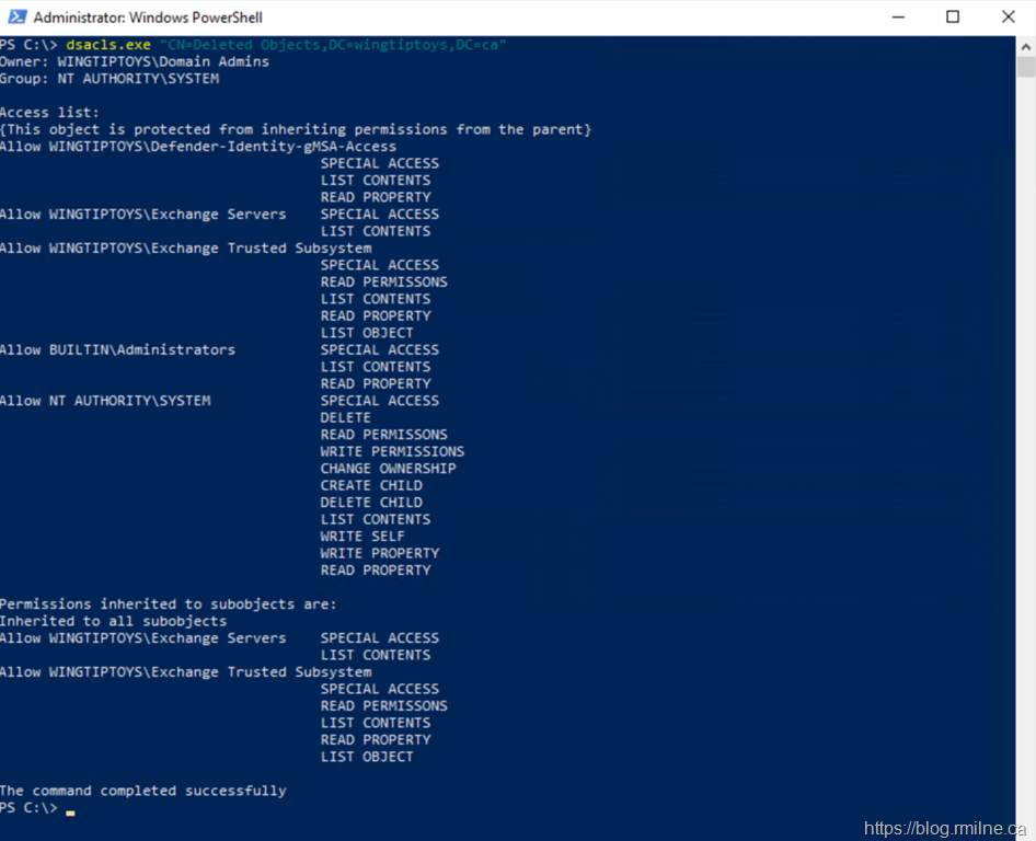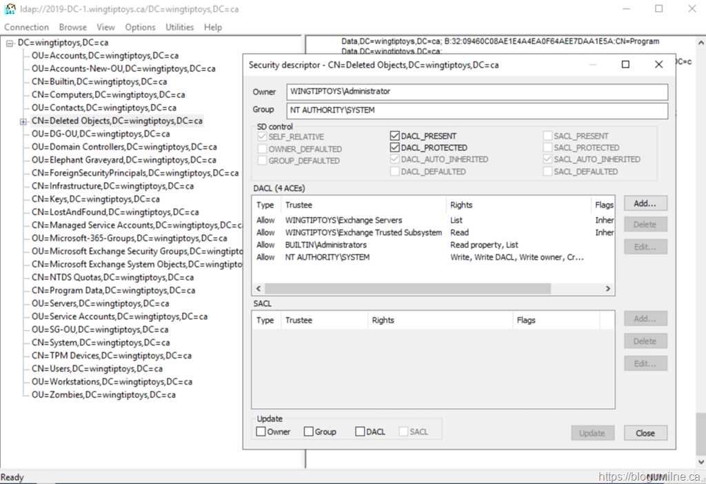 DSacls.exe "CN=Deleted Objects,DC=Wingtiptoys,DC=ca”