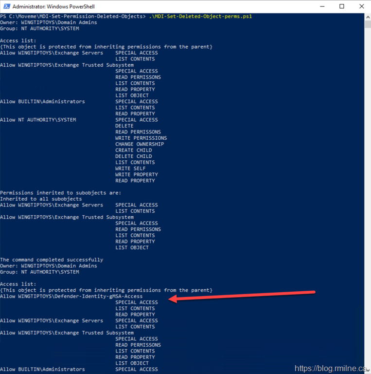 The code below was added to a local script file - .\MDI-Set-Deleted-Object-perms.ps1