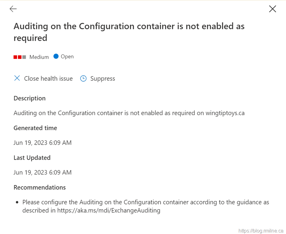 If we look at the details for the alert on Configuration container auditing we do not see exactly what the issue is. Granted this is one of the simpler AD DS auditing things that needs to be set, the guidance does not have to be that detailed as its a simple change to fix.