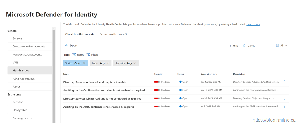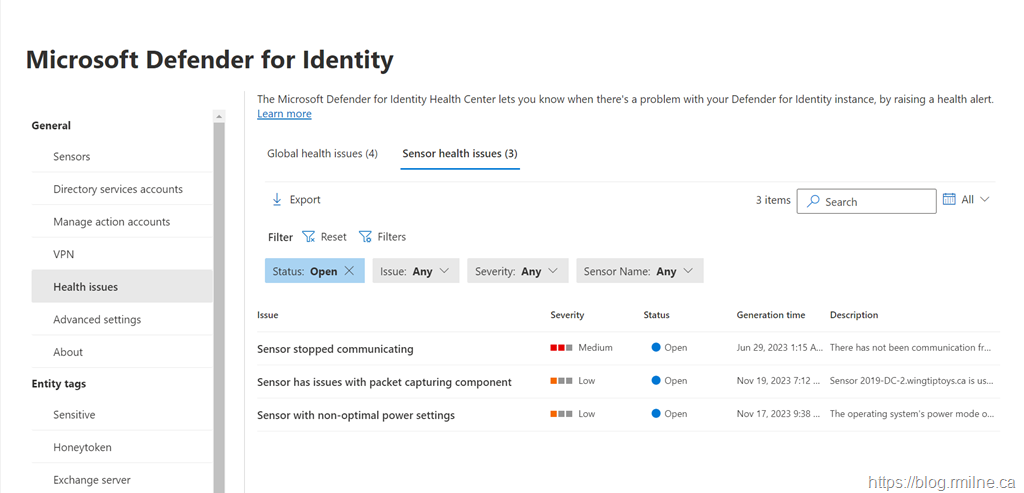 Examples of issues within the Global Health and Sensor Health areas are shown below. Issues with auditing should appear in the global section.