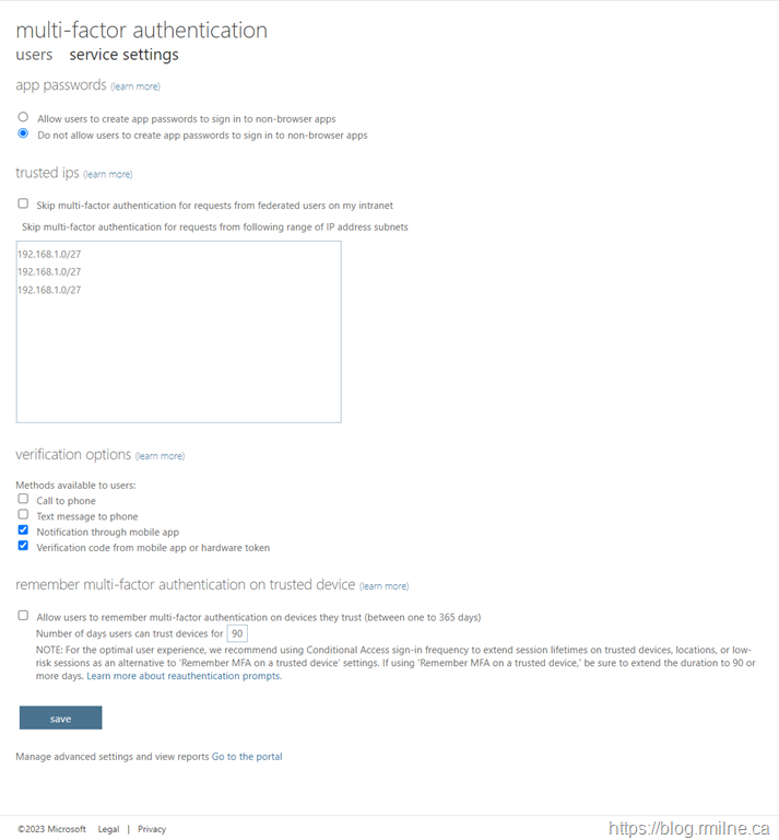 By default users could generate app passwords, there were no trusted IPs entered and all of the four MFA options were enabled. These MFA options operate at the tenant level. The option is either enabled for all users or no users. There is no granularity.