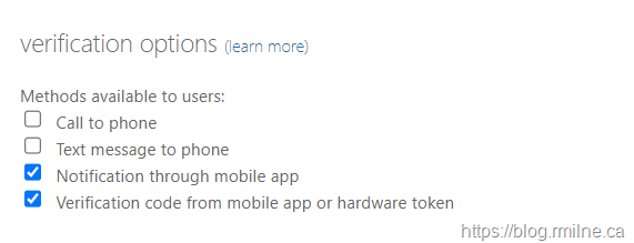 Zooming into the MFA options we can see that the telephony methods have been disabled for all users in this tenant.