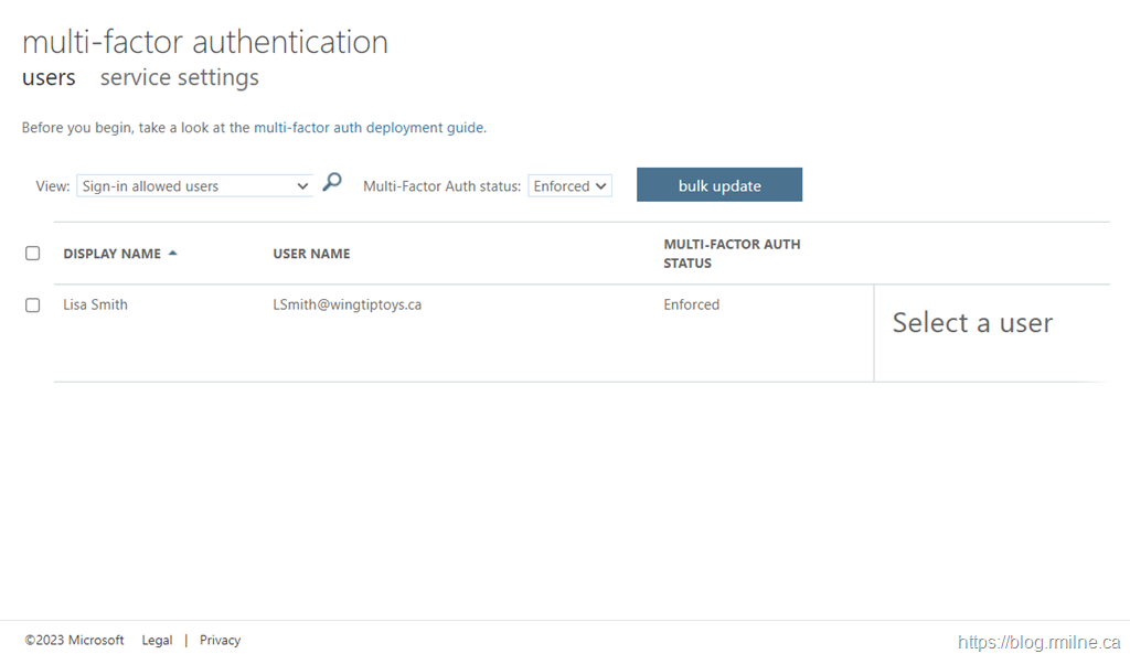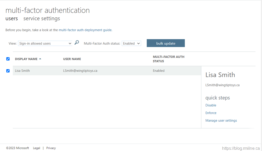 If we change to the users tab, then we can perform the per-user MFA enablement. This was a thing pre-conditional access. Realistically we should be using conditional access policies nowadays. They offer so much more control and flexibility.