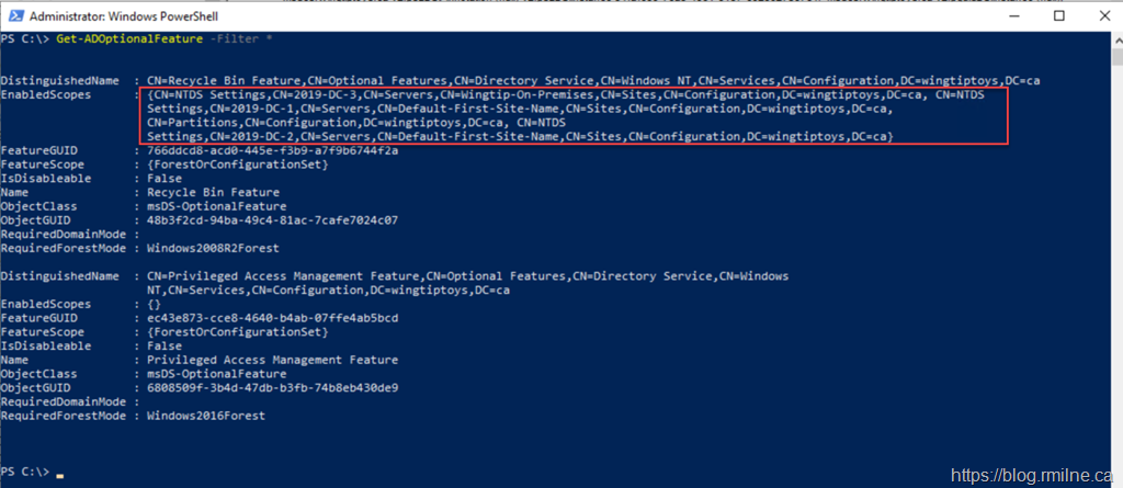 To verify that the AD Recycle Bin is enabled, we can view the contents of the EnabledScope output for the “CN=Recycle Bin Feature” as shown below. Since there are entries in this section, the feature was previously enabled.